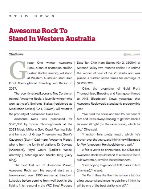 Around one month ago I thought Awesome Rock would be lost to WA based breeders, so for Alan and Sue Olive to retain this stallion (if confirmed) it will mean a huge boost to local stallion ranks with genuine proven quality, and from a family of black type success with direct link to multiple successful stallions around the World.